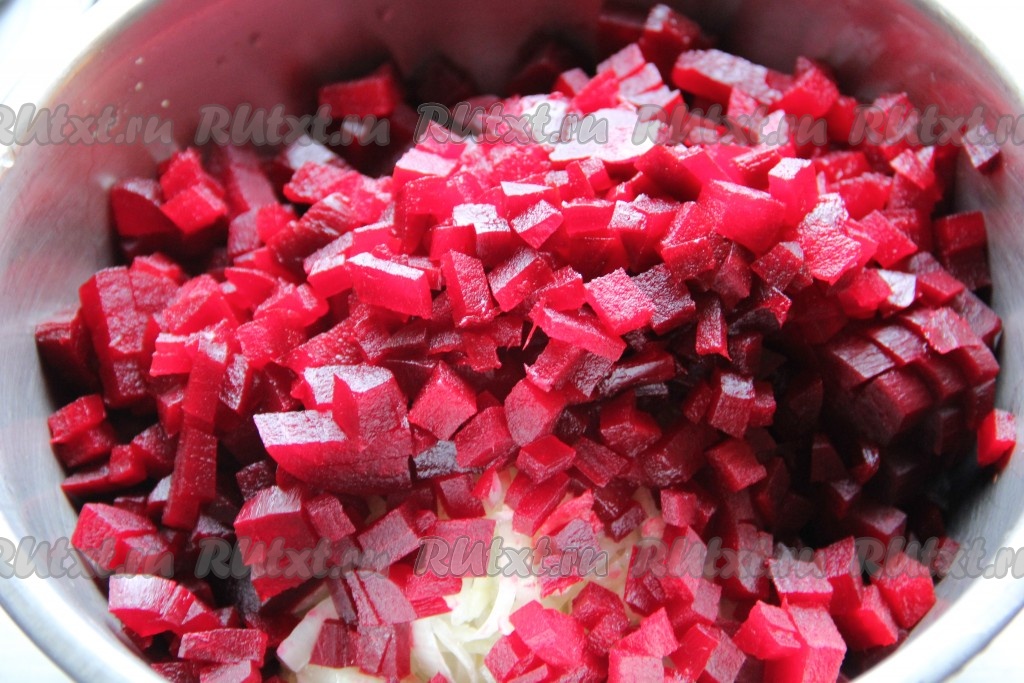 К яблоку добавить маринованный лук и отварную свеклу, нарезанную кубиками.