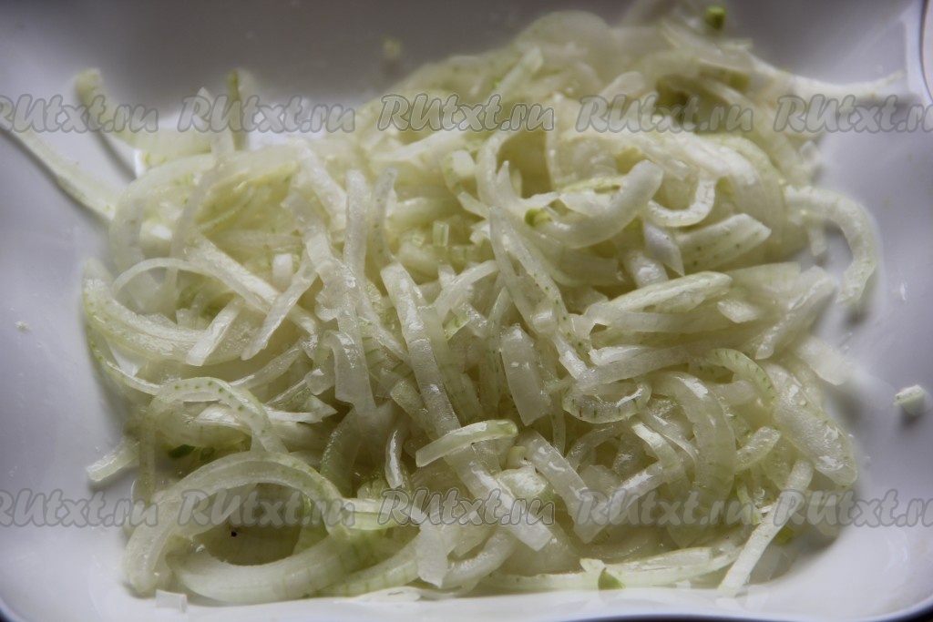 Лук нарезать полукольцами. Посыпать сахаром и взбрызнуть уксусом. Хорошенько обмять руками и оставить на пару часов, можно на ночь.