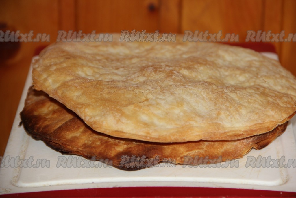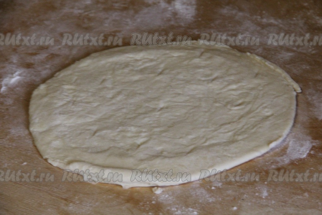 У меня слоёное бездрожжевое тесто было из 4 частей. Раскатать каждую часть слоёного теста на присыпанной мукой поверхности до толщины 0,5 сантиметра и вырезать круг диаметром 24-26 сантиметров. Удобно в качестве формы для вырезания круга использовать тарелку или крышку от кастрюли подходящего диаметра.