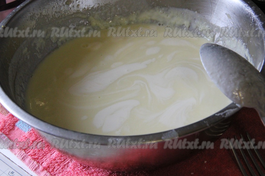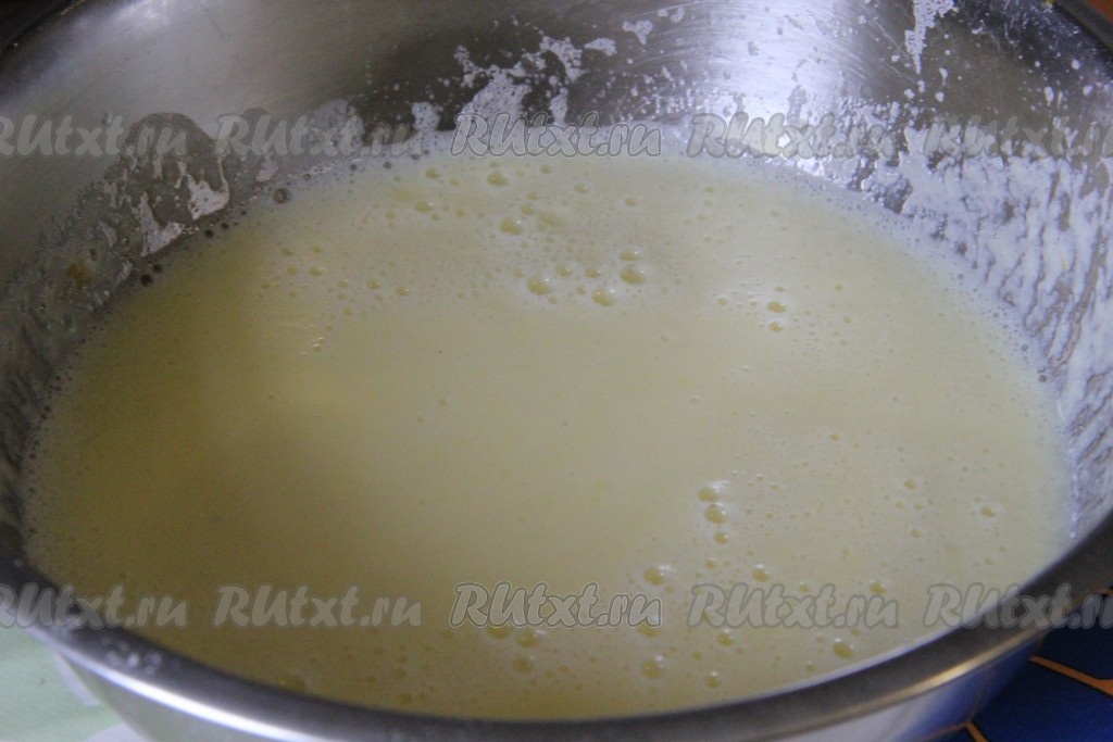 Вначале приготовим крем. Для этого молоко в кастрюле с толстым дном нужно довести до кипения, снять с огня, дать немного остыть. В отдельной миске взбить венчиком яичные желтки с крахмалом и сахаром до однородности.
