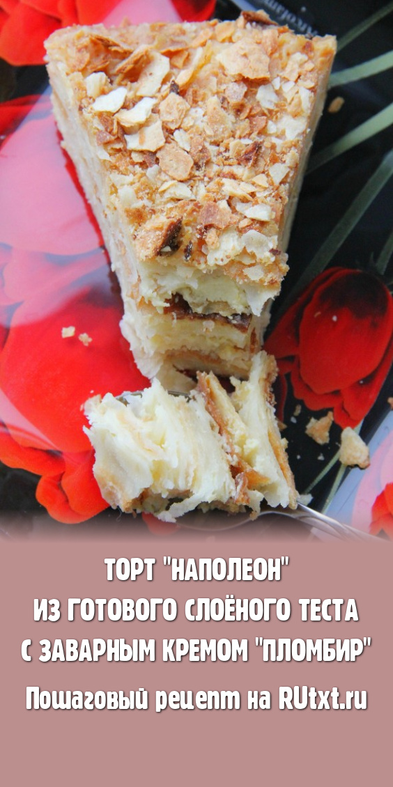 Оставить торт пропитываться на сутки в холодильнике. Торт "Наполеон" из покупного слоёного теста готовится очень просто, коржи хорошо пропитываются заварным кремом "Пломбир". Тортик получается нежнейшим, не жирным и очень вкусным!