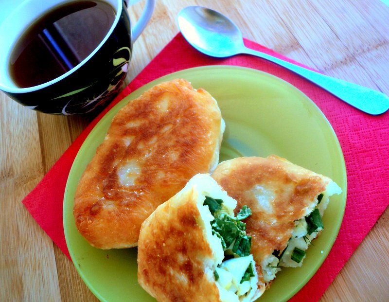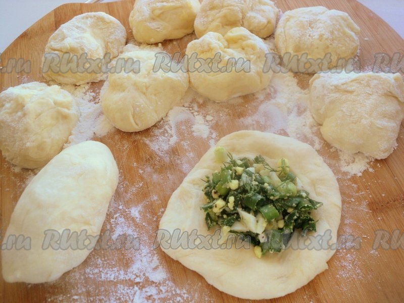 Размять каждый кусочек теста в лепёшку. Положить на середину лепёшки 1 столовую ложку начинки из зелёного лука и яиц, защипнуть тесто над начинкой, формируя пирожок. Постепенно сформировать все пирожки.