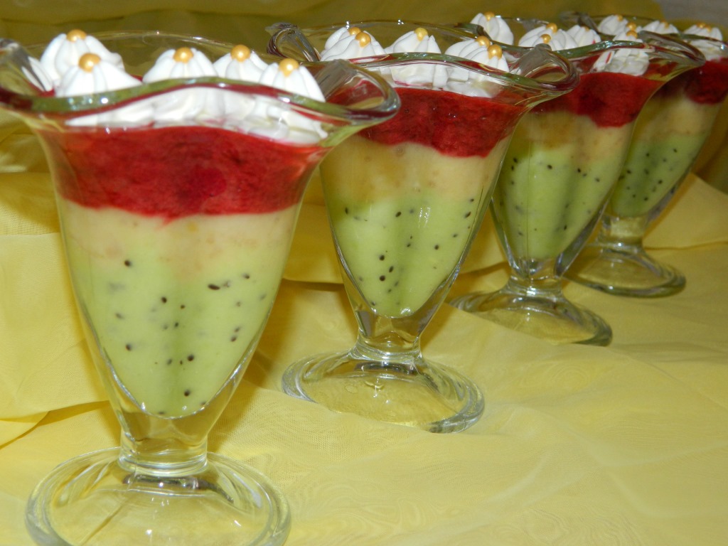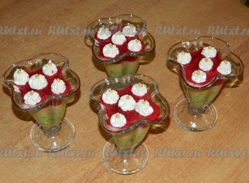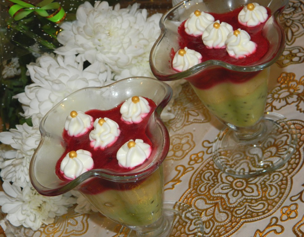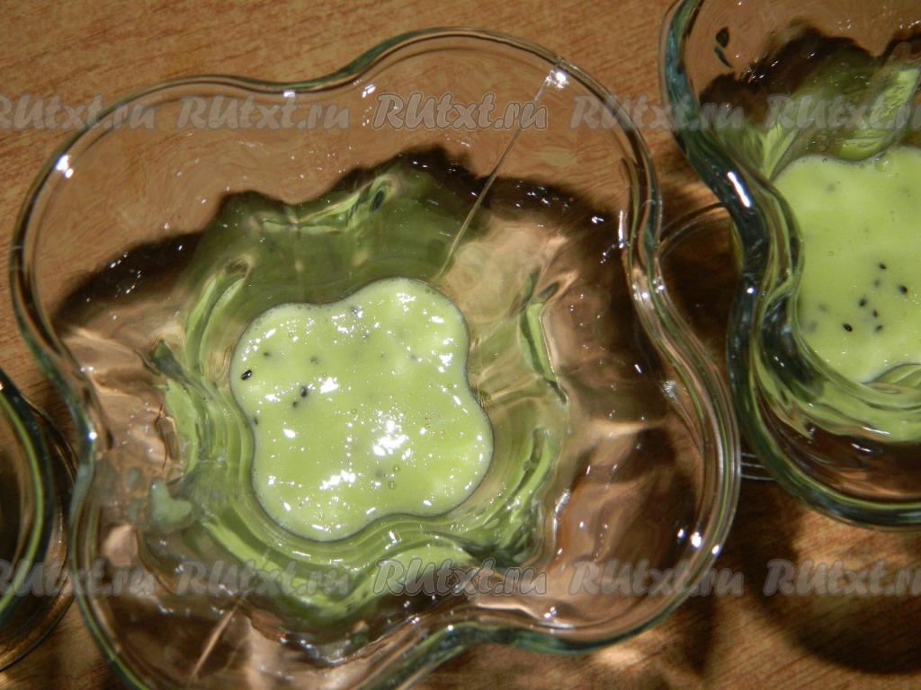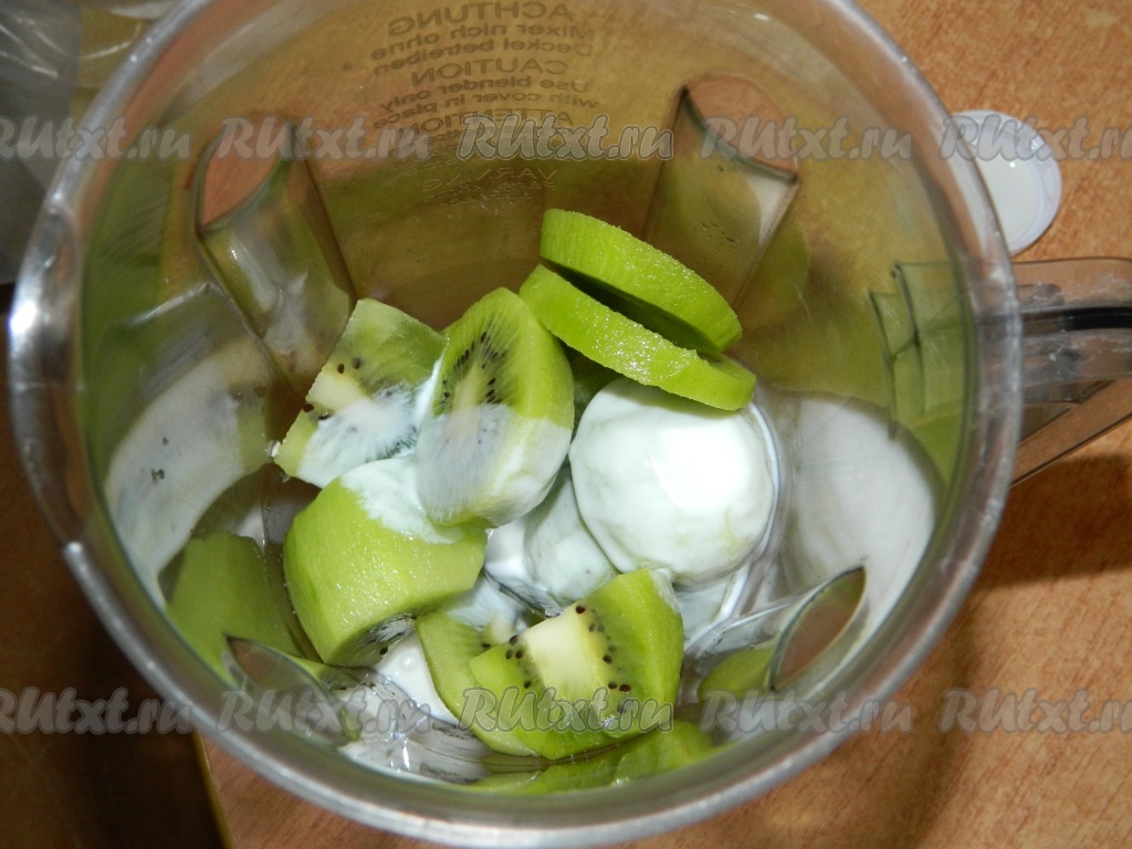 Далее взбиваем банан и ещё немного йогурта. И аккуратно выкладываем в креманки на киви.