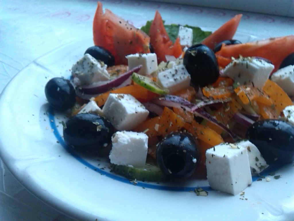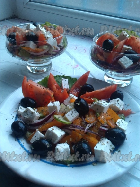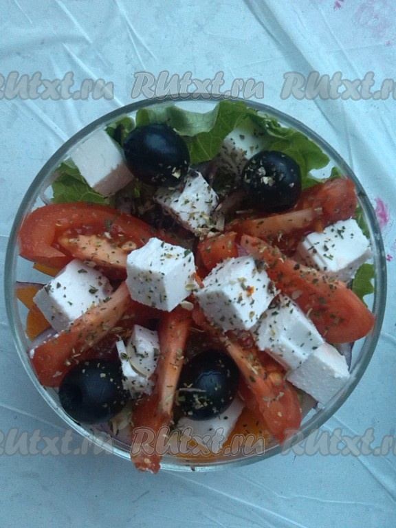Вкусный, яркий, сочный греческий салат с фетой и помидорами готов.