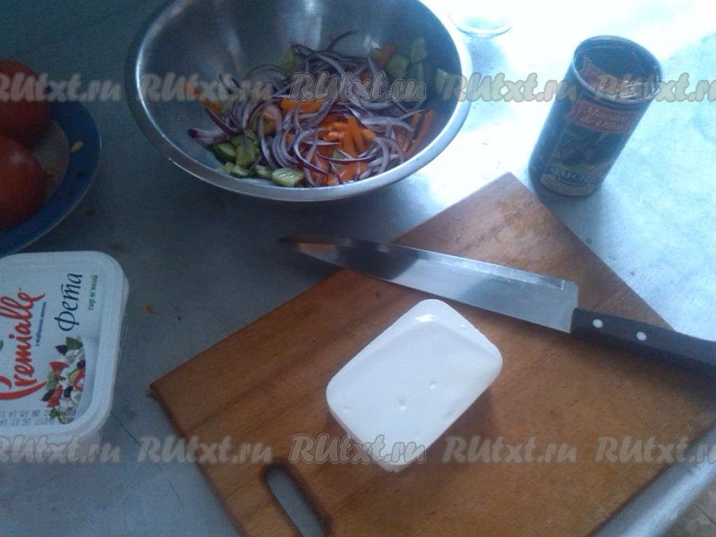 Нарезать сыр "Фета" на кубики (но не смешивать пока с овощами, так как он легко ломается и крошится). Сыр следует добавлять в греческий салат уже перед самой подачей.