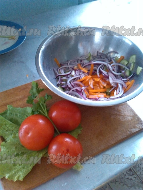 Лук нарезать полукольцами, болгарский перец - на полоски, помидоры - на небольшие дольки, огурец - на полукружочки (или кружочки), переложить овощи в глубокую миску.