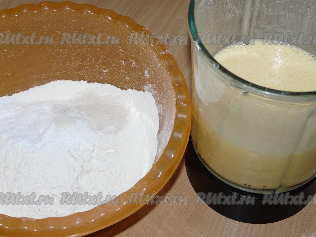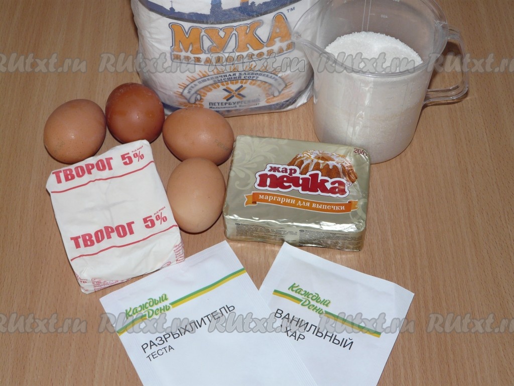 Яйца взбить с сахаром с помощью миксера в течение минут 5-6 (масса должна немного увеличиться в объёме и посветлеть). Маргарин растопить (можно это сделать в микроволновке), остудить его (растопленный маргарин не должен быть горячим). К яйцам, взбитым с сахаром, добавить творог и растопленный маргарин, взбить миксером до однородности. В отдельную миску просеять муку, смешать её с разрыхлителем и ванильным сахаром.