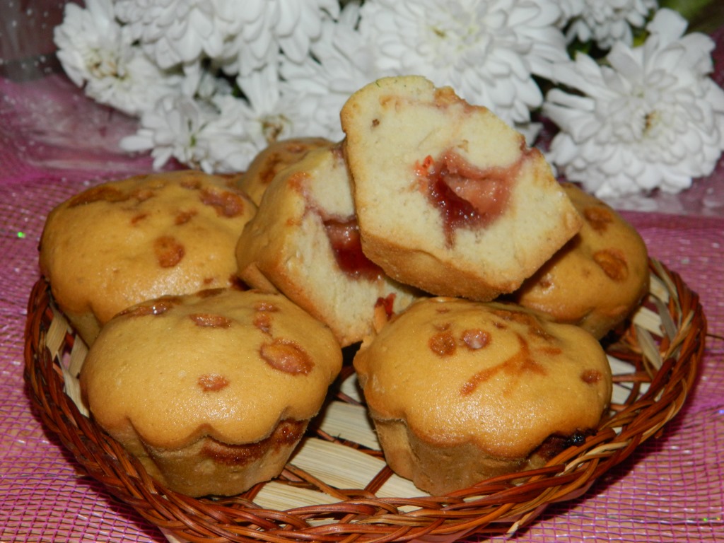 Разложить немного теста по формочкам, в центр положить немного начинки (джема) и сверху еще немного теста. Выпекать при температуре 180 градусов минут 25-35.