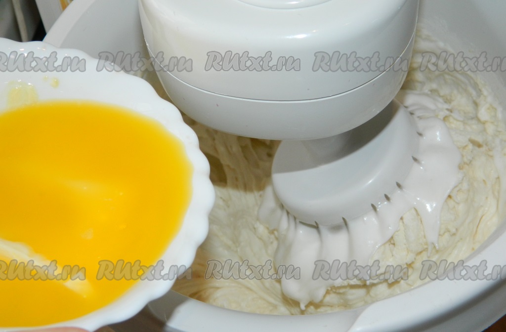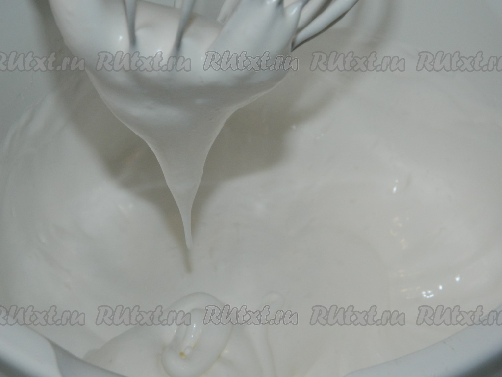 Маргарин растопить, дать ему остыть. Хорошо охлаждённые белки взбить с сахаром с помощью миксера до получения воздушной белковой массы.