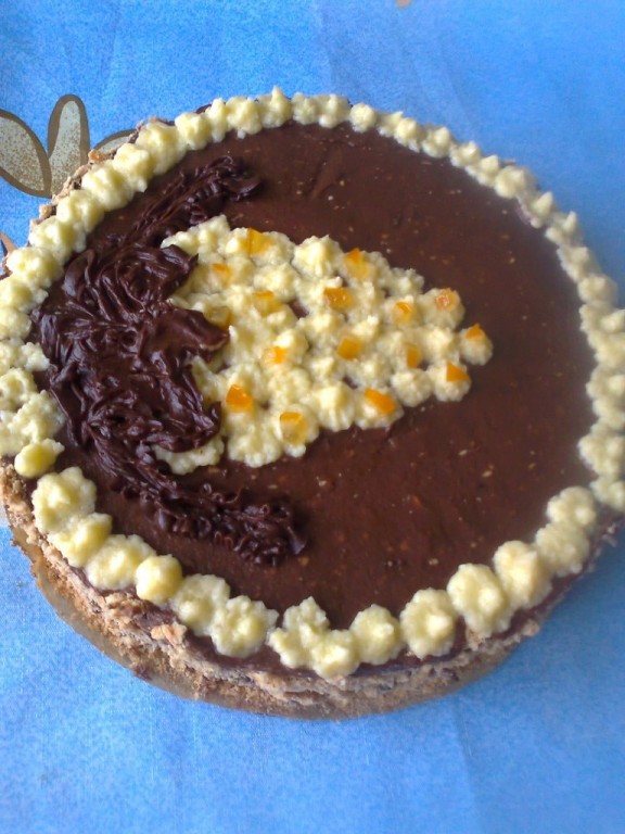 В оставшийся белый крем тоже добавьте 1 столовую ложку коньяка и взбейте. Отложите 3 столовых ложки белого и 3 столовых ложки шоколадного крема для украшения торта. Далее больший корж положите на низ (можно на подставке от разъёмной формы), сверху поместите корж меньшего размера.