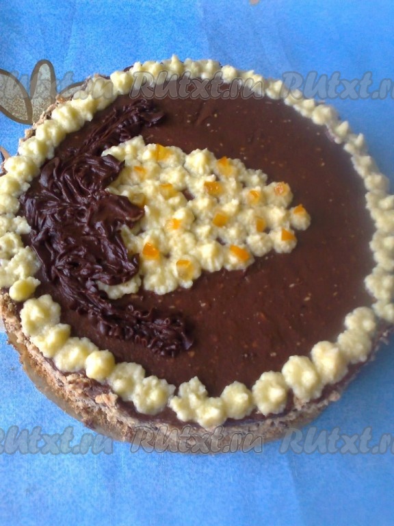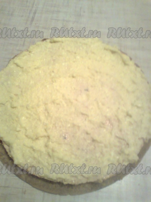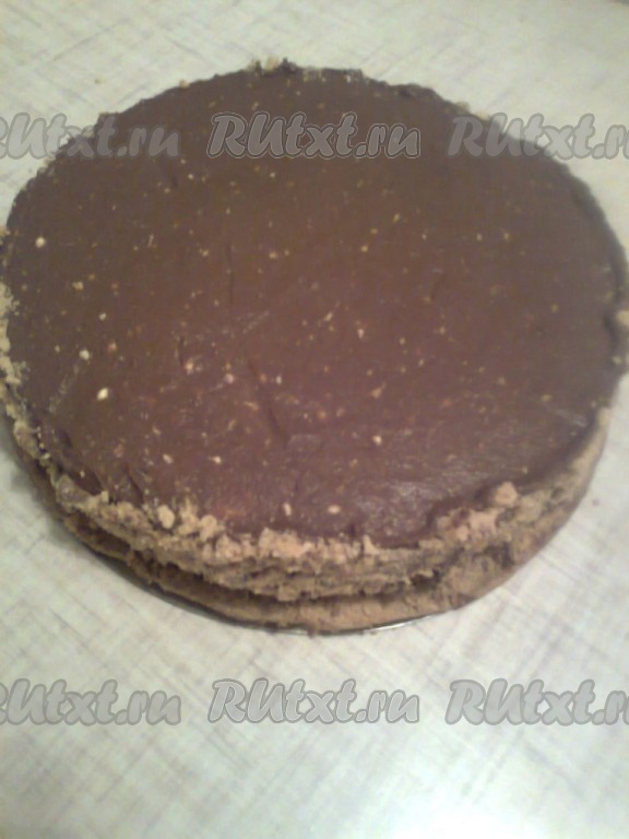 Накройте другим коржом. Верх и бока торта промажьте шоколадным кремом.