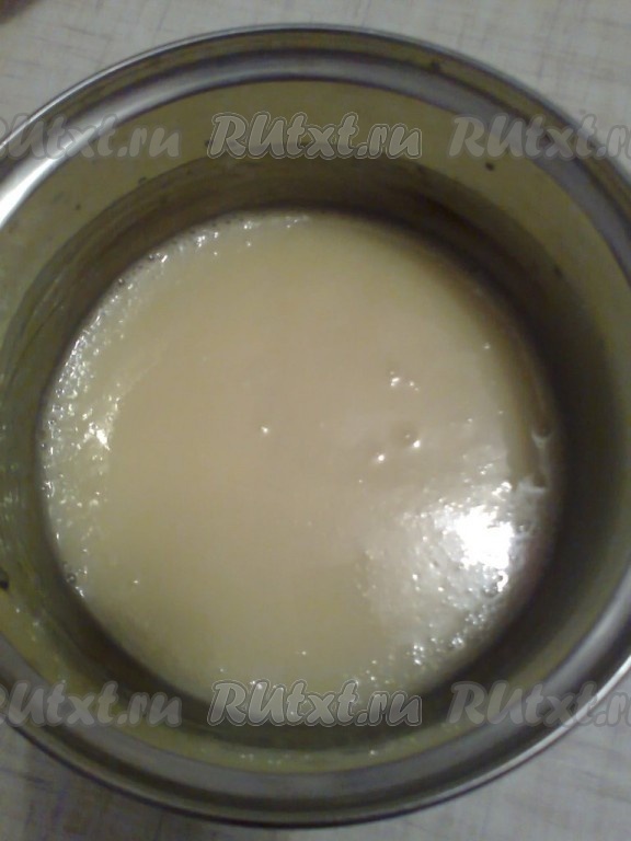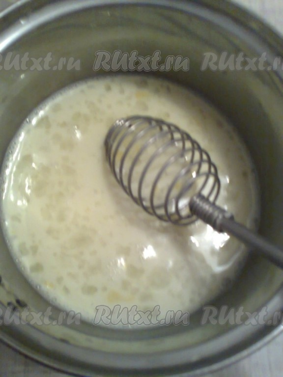 Для приготовления крема "Шарлотт" для киевского торта достаньте масло из холодильника и оставьте при комнатной температуре для размягчения. Приготовьте сироп, для этого в кастрюле слегка взбейте венчиком 150 миллилитров молока с 1 яйцом (не в пену, а до полного смешивания).