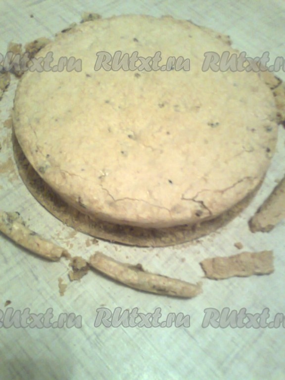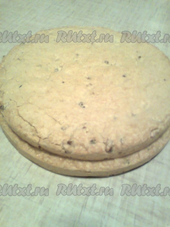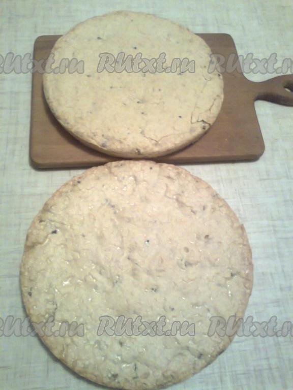 Разложите смесь в формы, если форма не силиконовая, выстелите ее бумагой. Я использовала две формы - разъёмную форму диаметром 24 сантиметра и силиконовую диаметром 23 сантиметра. Больший корж потом надо будет подрезать и получившаяся крошка пойдёт на обсыпку торта. Высота коржа получится 1,5 сантиметра. Пеките коржи в разогретой духовке при температуре 150 градусов в течение 30 минут, затем уменьшите температуру до 130 градусов и пеките ещё 1 час, оставьте в выключенной духовке на 30 минут. Готовые коржи можно оставить на 12-24 часов для упрочнения структуры, на вид коржи должны быть бежевые, сухие.
