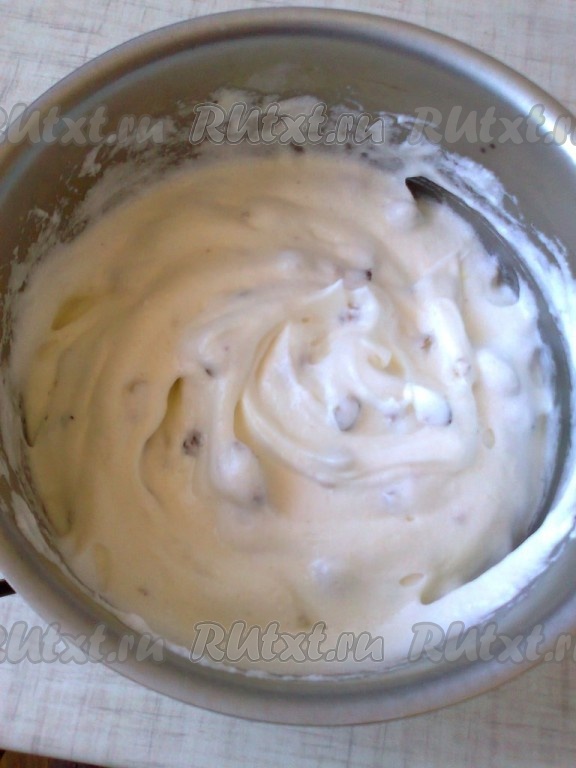 Сироп остудите, накрыв крышкой (или плёнкой), чтобы не заветривался. Взбейте 250 грамм мягкого сливочного масла миксером в светлую массу с пакетиком ванильного сахара. Добавляйте по столовой ложке сироп, взбивая каждый раз. Крем "Шарлотт" для киевского торта получится пышным.