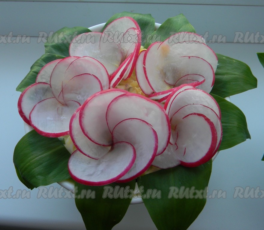 Из колечек редиски сформировать цветочек (понадобится 5-6 колечек), накладывая внахлест друг на дружку, свернуть и аккуратно воткнуть в салатик.
