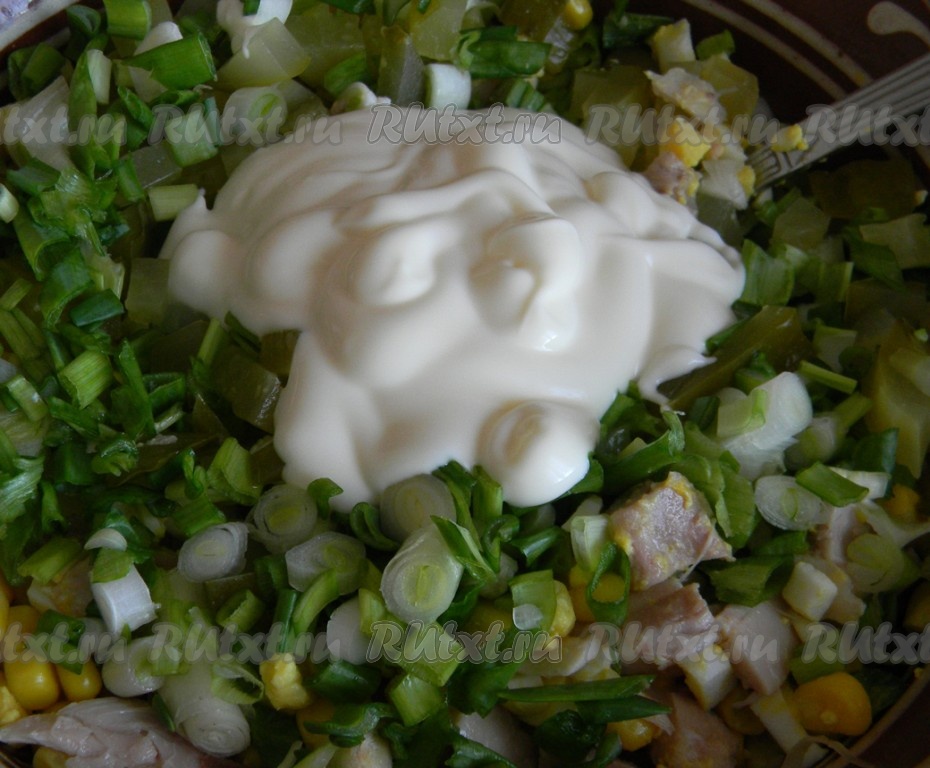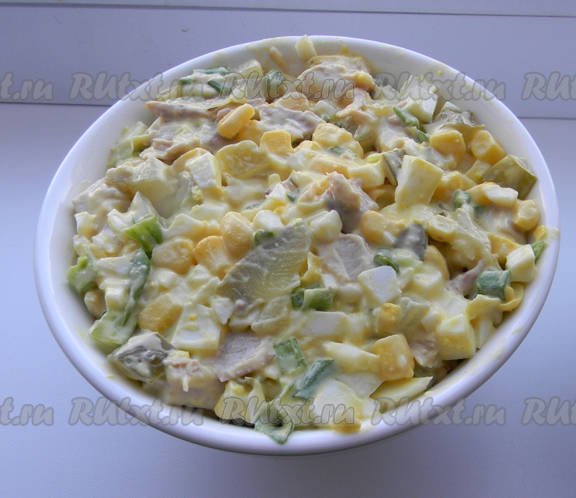 Курицу и яйца отварить, остудить и порезать кубиками. Огурцы и зеленый лук тоже порезать. Все соединить, добавить кукурузу, майонез, посолить, поперчить и перемешать.