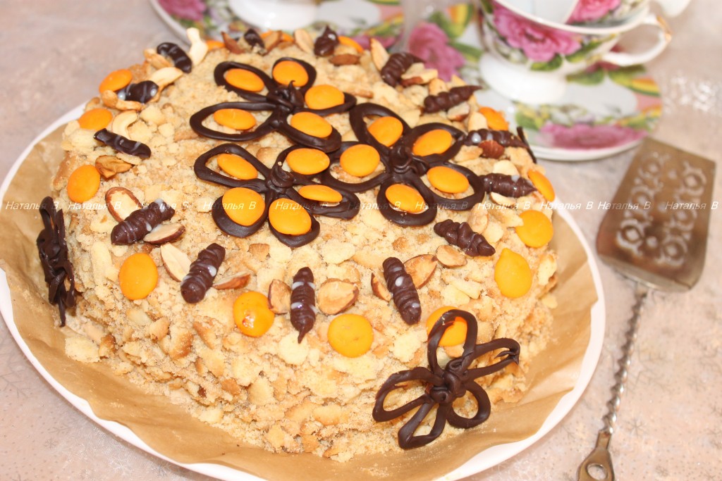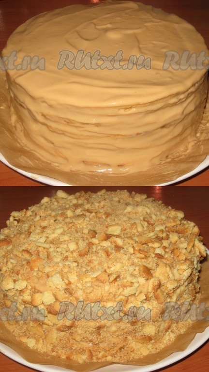Крошкой из обрезков обсыпать бока и верх торта "Рыжик". Готовый торт убрать в холодильник на несколько часов для пропитки.