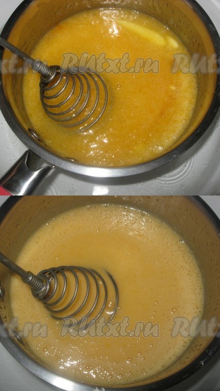 Поставить на водяную баню (то есть в кастрюлю большего диаметра, чем кастрюлька с масляно-медовой смесью, налить тёплую воду, в неё поставить кастрюльку с масляно-медовой смесью), поставить на средний огонь, постоянно помешивая венчиком, варить до закипания воды, затем уменьшив огонь до минимума, продолжать готовить, не переставая перемешивать, до полного растворения продуктов и получения однородной, пышной, кремовой консистенции (мне на это обычно требуется минут 10-15).