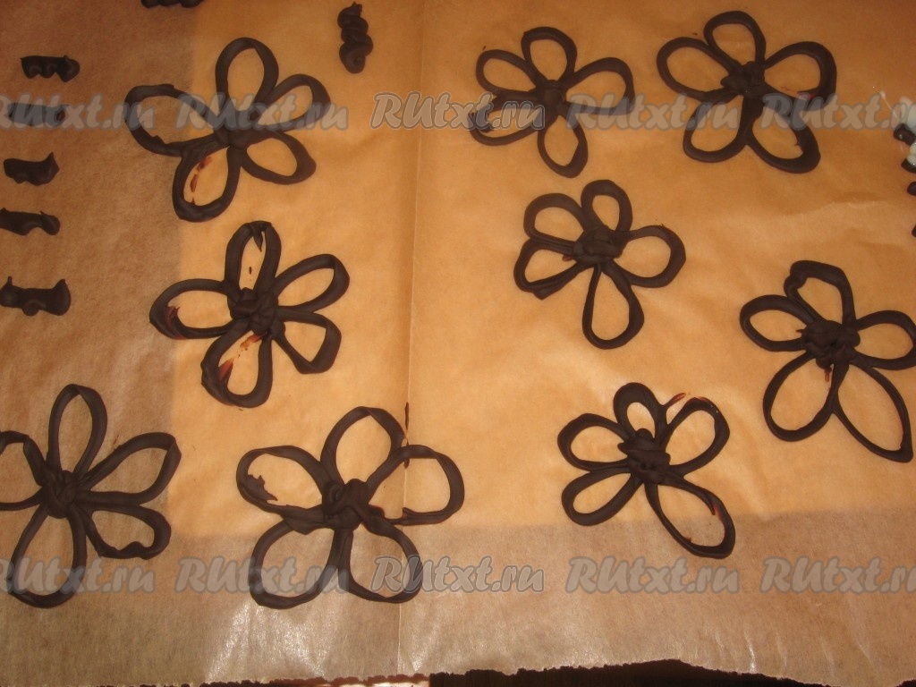 Украсить торт "Рыжик" можно по желанию: сделать сеточку из варёной сгущёнки, посыпать свежими ягодами, сделать какое-нибудь украшение из мастики, я сделала вот таких пчёлок и цветочки (подсмотрела на одном кулинарной сайте, но немного изменила): на водяной бане растопить шоколад, мёд и сливки до эластичной массы, выложить полученную массу в уголок пакета, сделать маленькое отверстие и высадить на разделочную доску, застеленную пергаментом, небольшие толстенькие полосочки, убрать их на несколько минут в морозилку, затем достать, взять на чайную ложку сгущёнку и тонкой струйкой полить "пчёлок", делая полосочки, снова убрать в морозилку до полного застывания. Также на пергаменте "нарисовать" цветочки и убрать в морозилку.