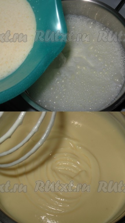 Оставшиеся 250 миллилитров молока вылить в небольшую кастрюльку (или ковшик), поставить на огонь и довести до кипения, затем огонь сделать минимальным. Тонкой струйкой, непрерывно перемешивая венчиком, в чуть кипящее молоко влить смесь молока, яиц и муки. Постоянно помешивая венчиком, довести заварную до загустения, снять с огня.