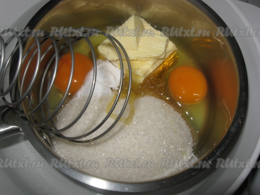 Вначале замесим тесто для коржей, для этого яйца, сахар, сливочное масло, соду и мёд нужно соединить в маленькой кастрюльке (или ковшике).