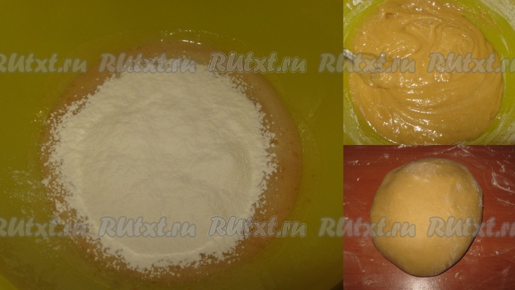 Снять получившуюся массу с огня и сразу, постепенно всыпая в неё просеянную муку, замесить мягкое, чуть липнущее к рукам тесто.