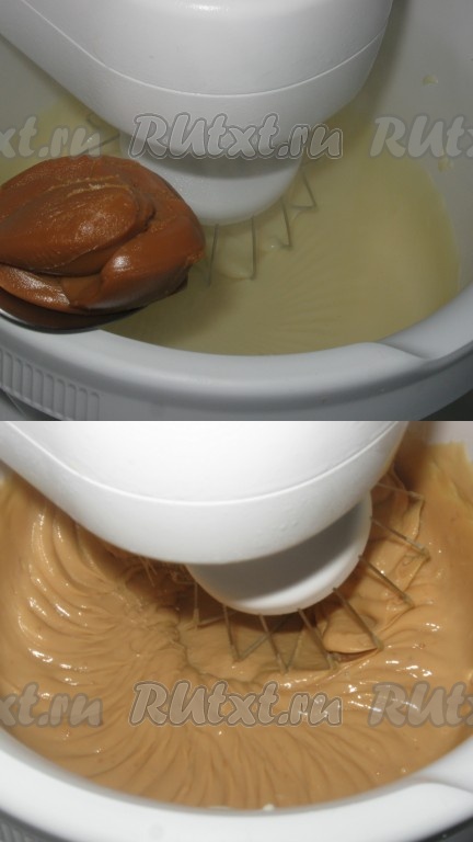 Заварную массу перелить в чашу миксера, начать взбивать на большой скорости. Постепенно добавляя варёную сгущёнку, взбить крем до однородной консистенции и цвета.