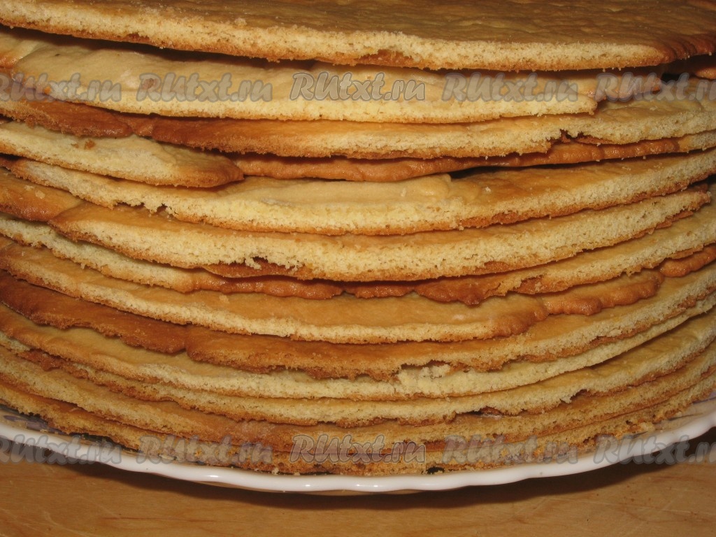 Готовый корж сразу обрезать по тарелочке, которая подойдёт по диаметру. Коржи складывать стопочкой на блюдо, обрезки - в отдельную миску.