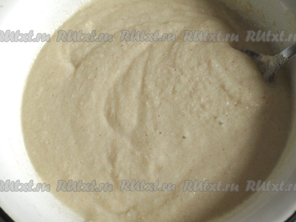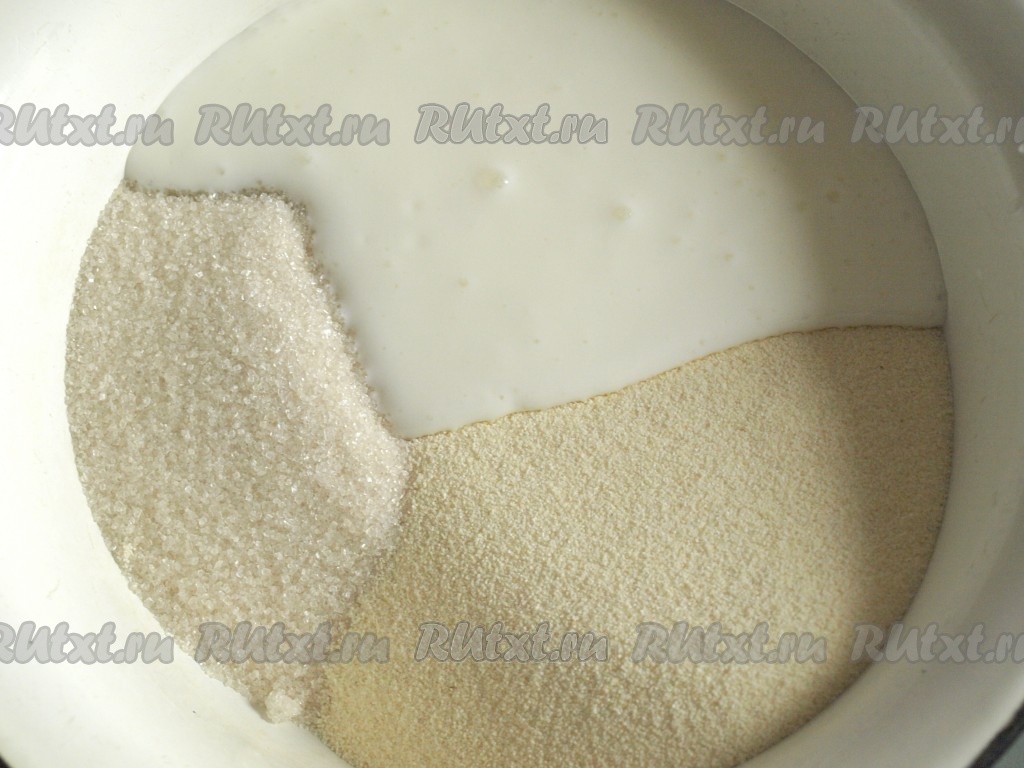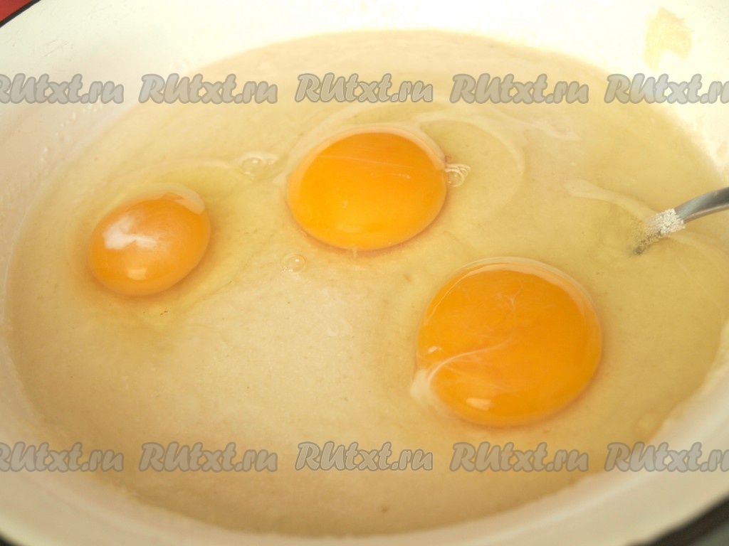 По прошествии 30-40 минут к получившейся массе добавить яйца и хорошо перемешать тесто для манника, оно получится в меру густым, напоминающим сметану средней густоты.