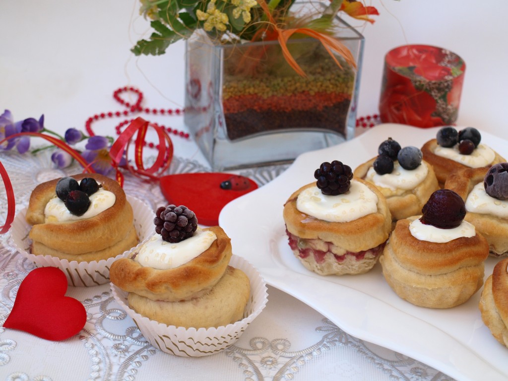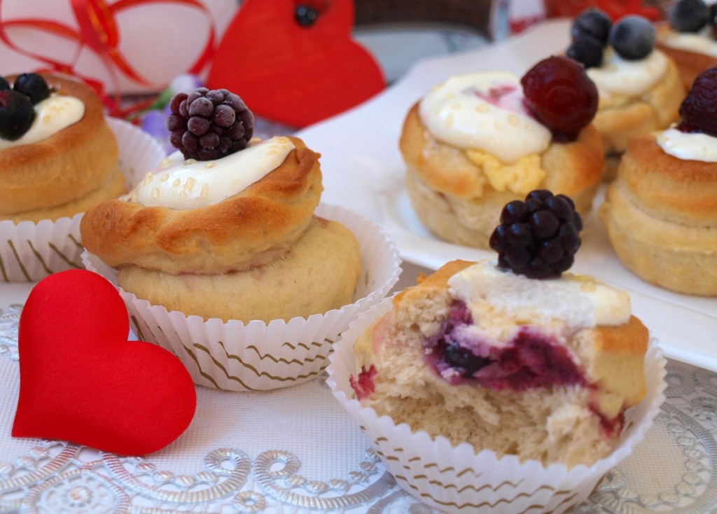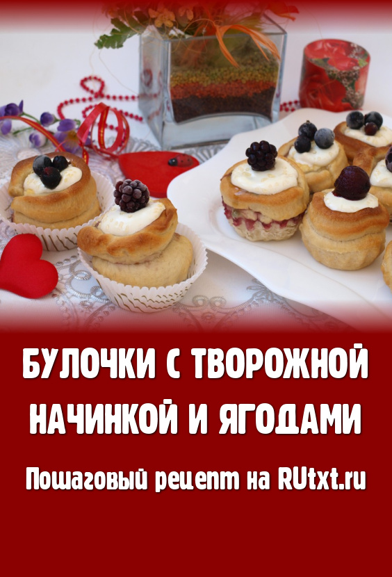 Очень нежные и замечательные булочки с творожной начинкой и ягодами. По внешнему виду эти булочки очень похожи на пирожные, да и вкус у них отменный. Бесподобный вариант к чаю или кофе!