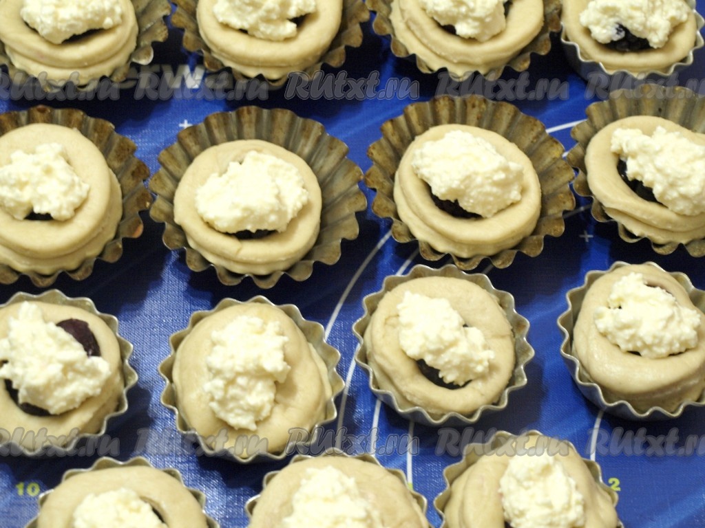 Сверху ягод разложить творожную начинку и оставить булочки ещё на 10-15 минут для подхода.