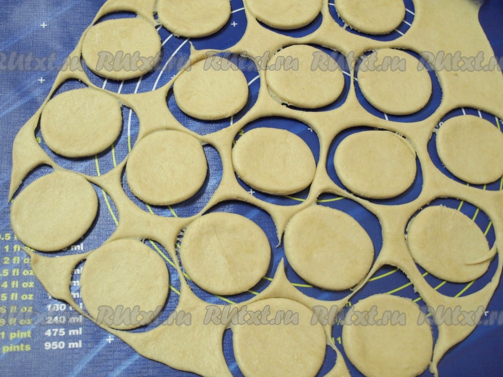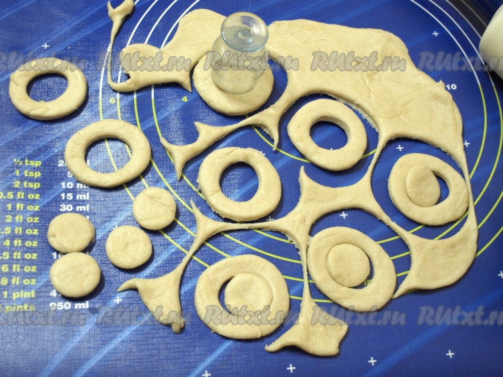Половину полученных кружков оставить как есть, а у остальных маленькой рюмкой вырезать по центру ещё один круг, что-то типа бублика.
