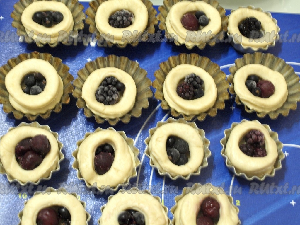Формочки для кексов смазать маслом и выложить на дно целые кружки, сверху них - с отверстием. В центр положить по несколько ягод.