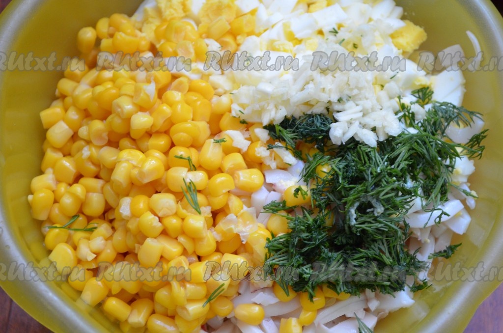 Нежный, вкусный салат с кальмарами и крабовыми палочками и кукурузой готов. Выложить в салатник и можно подавать.