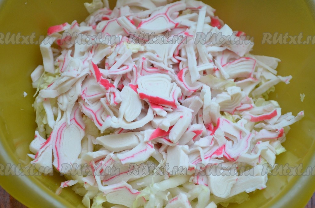 Крабовые палочки мелко порезать. Сложить к капусте.