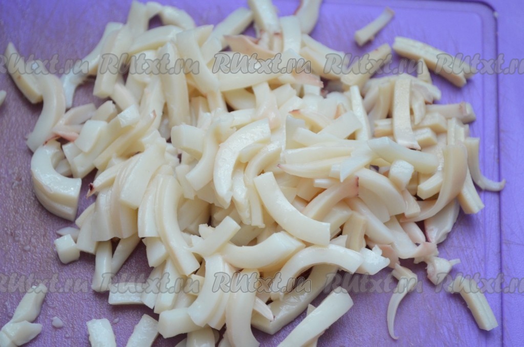 Для того чтобы сварить кальмара, его нужно опустить в кипящую воду и варить 2 минуты после закипания воды. Затем очистить от пленок и хорды. Отварного кальмара порезать мелкой соломкой.