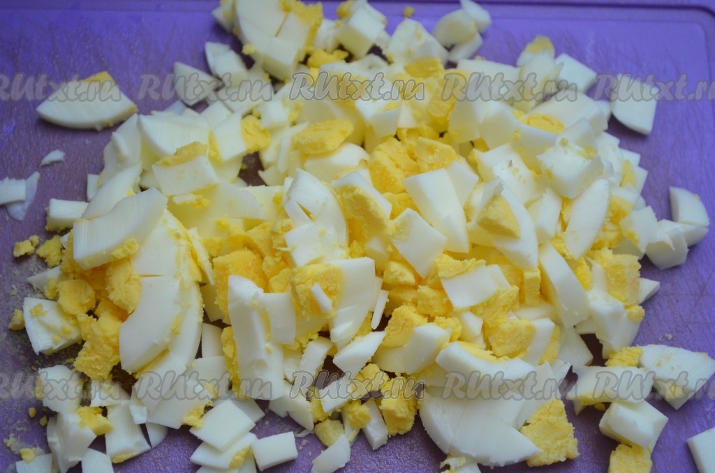 Яйца сварить вкрутую, нарезать.