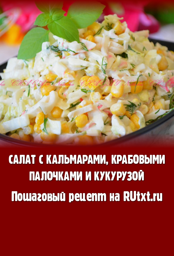 Салат с кальмарами, крабовыми палочками и кукурузой, думаю, придется по вкусу всем, кто его попробует. Все ингредиенты прекрасно сочетаются. Можно смело включать его в праздничное меню.