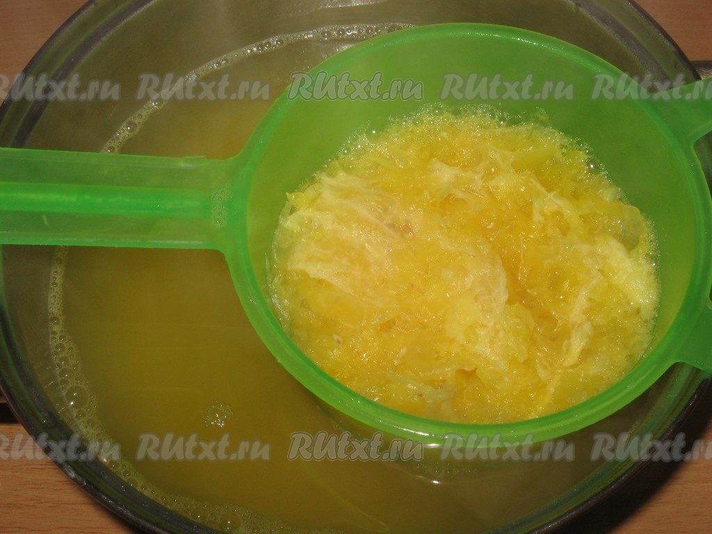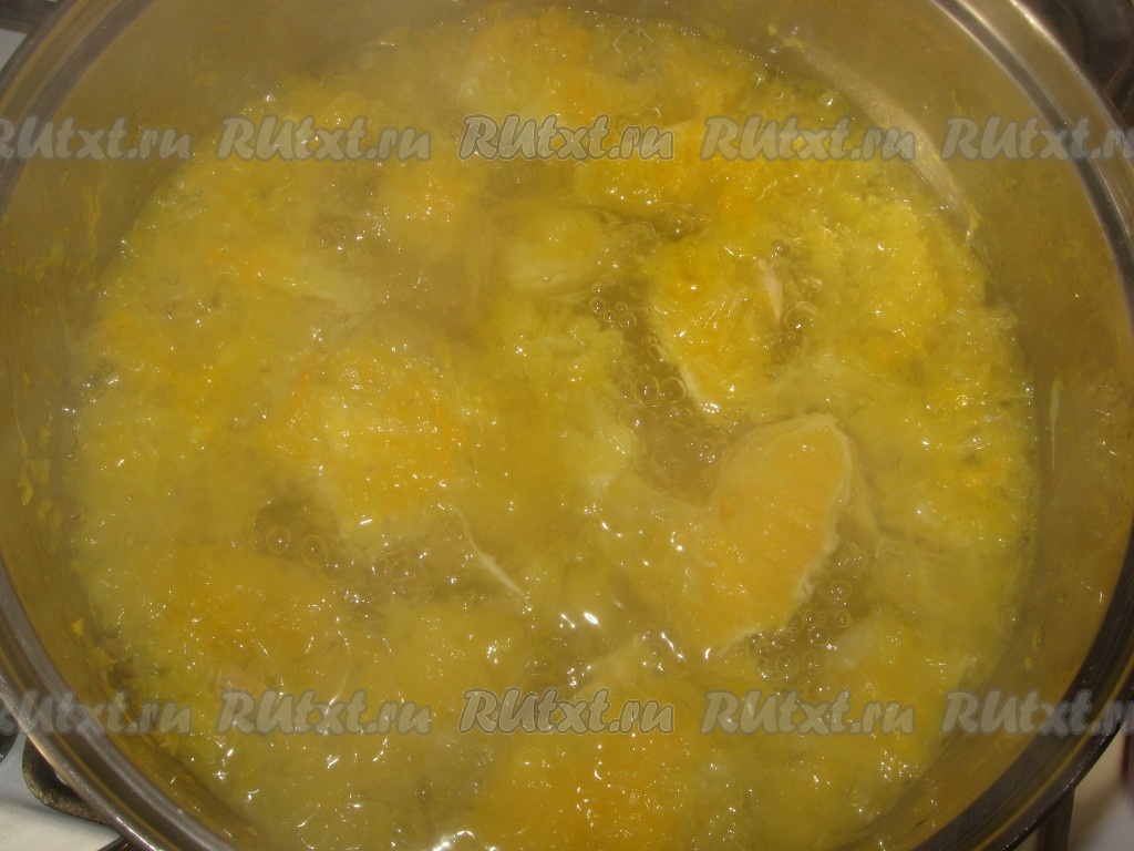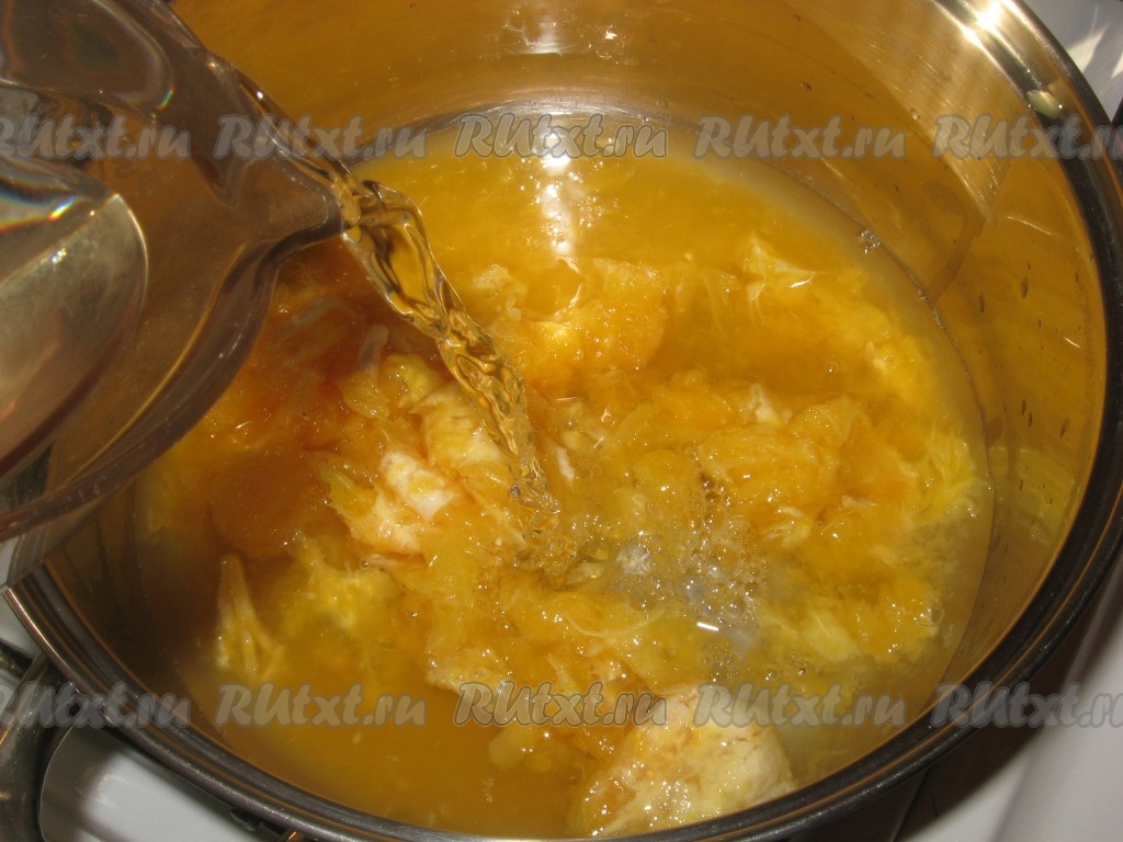 Мякоть апельсинов залить 1 литром холодной воды, поставить на огонь, довести до кипения и варить еще минут 5-7.