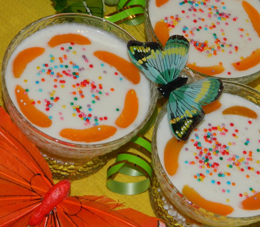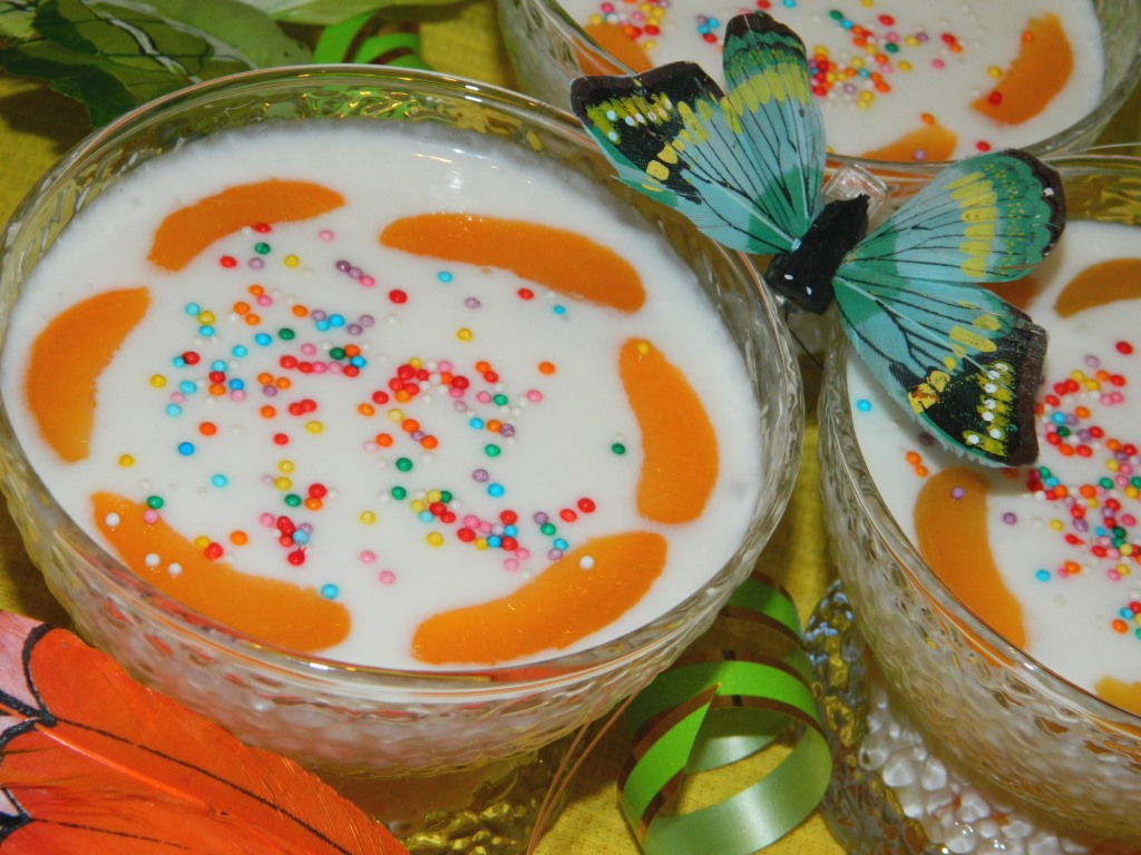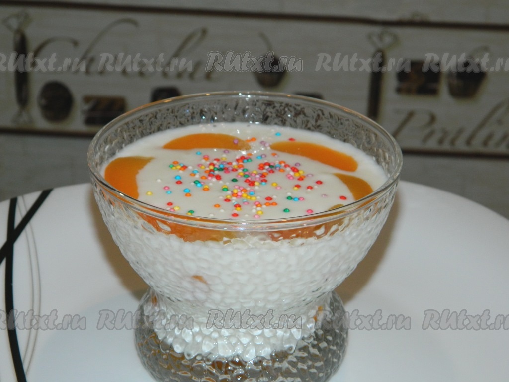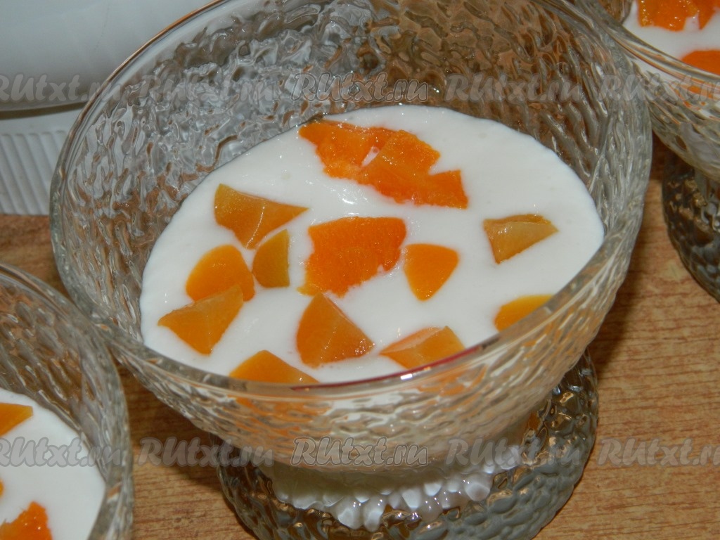 На дно креманок выкладываем фрукты, заливаем немного смесью, ещё слой фруктов и сверху накрываем ещё слоем кефирной смеси.