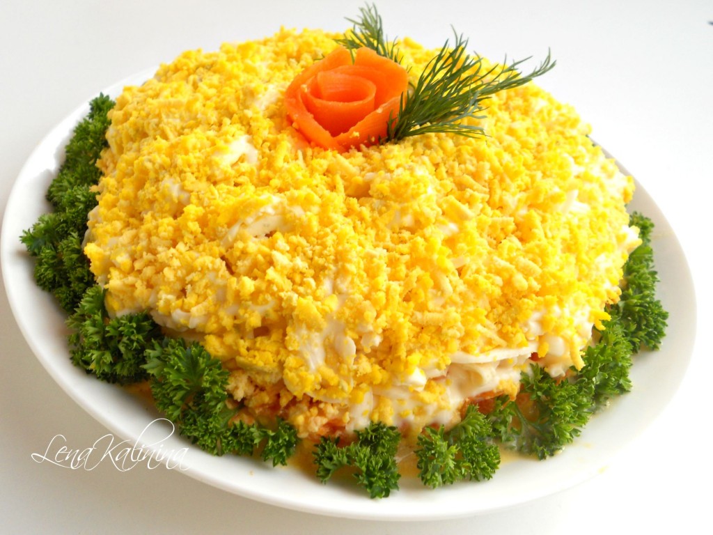 Наверное все знают этот простой и безумно вкусный салат и готовят его немного по-разному. Я предлагаю Вам попробовать свой вариант - салат "Мимоза" с плавленным сыром и сливочным маслом. Получается салатик очень вкусным, нежным и воздушным и к тому же по-весеннему ярким и красивым!