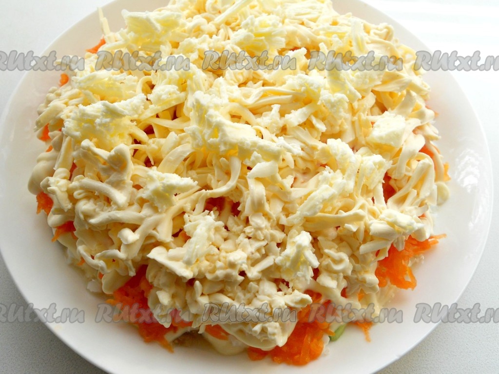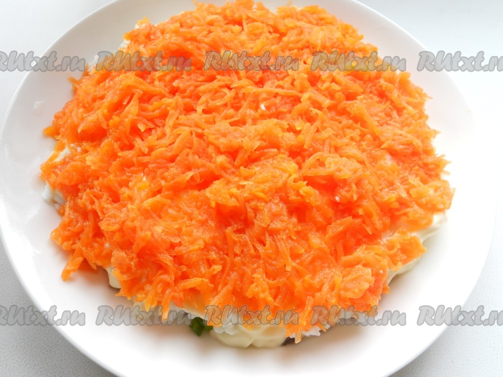 Далее - слой натертой на средней терке моркови + майонез.