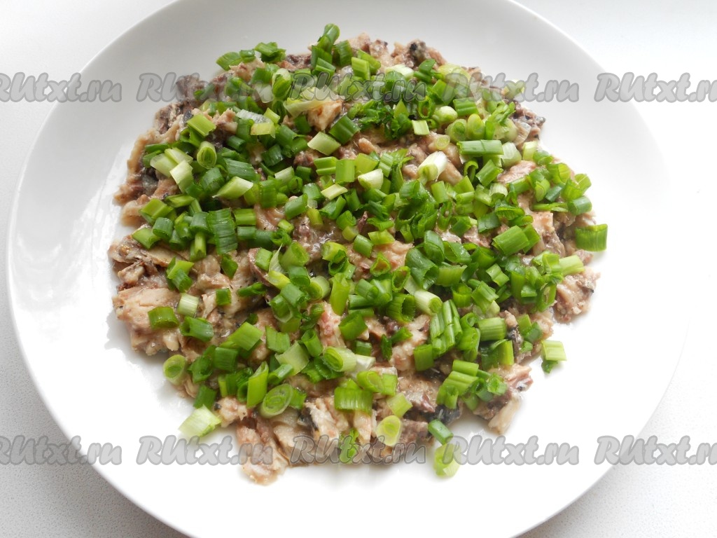 Рыбку консервированную размять хорошо вилкой и выложить первым слоем. Сверху посыпать измельченным зеленым луком, смазать майонезом (в этом салате лучше делать майонезную сетку, чтобы слои не придавливать).