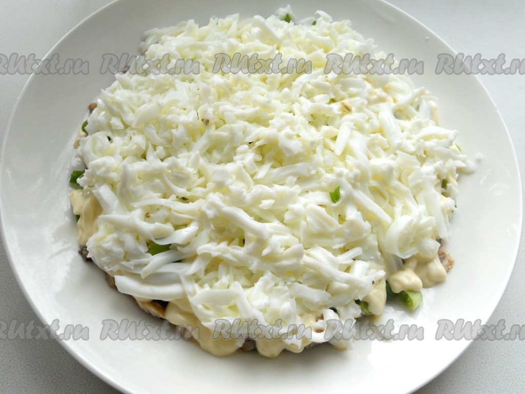 Следующий слой - натертые на крупной терке белки яиц + майонезная сетка.