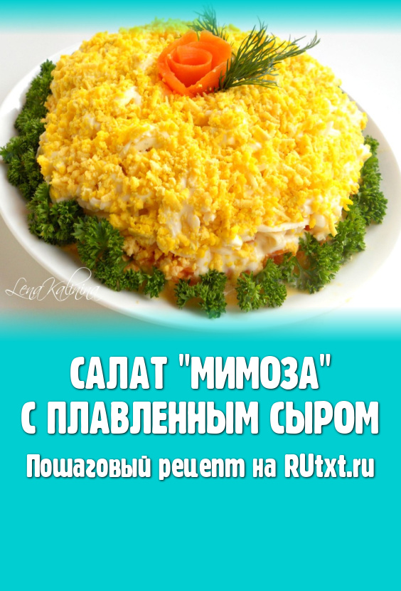 Сверху салат посыпать тертыми на мелкой терке желтками. Украсить этот замечательный, вкуснейший салат "Мимоза" с плавленным сыром по своему усмотрению - овощами и зеленью. Дать салату пропитаться 2-3 часа, поместив его в холодильник.