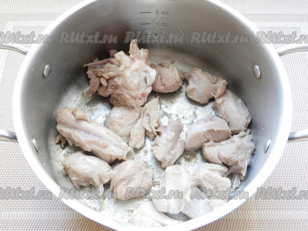 Мясо на косточке нарезать средними кусочками, от костей не очищать.