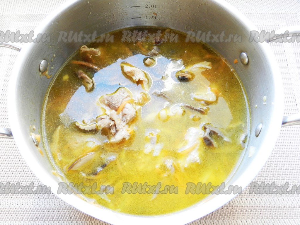 Влить процеженный грибной бульон. Горячей водой довести до объема 1,5 литра и варить в течение 40 минут.
