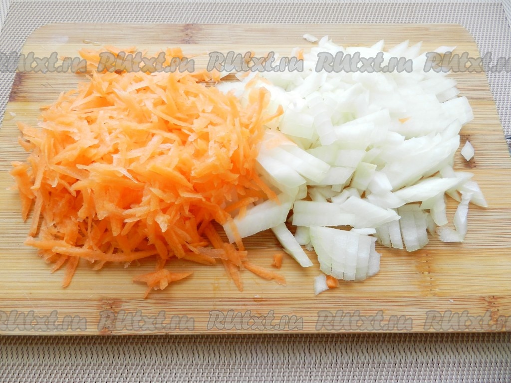 Лук нарезать кубиками, морковь натереть на терке.