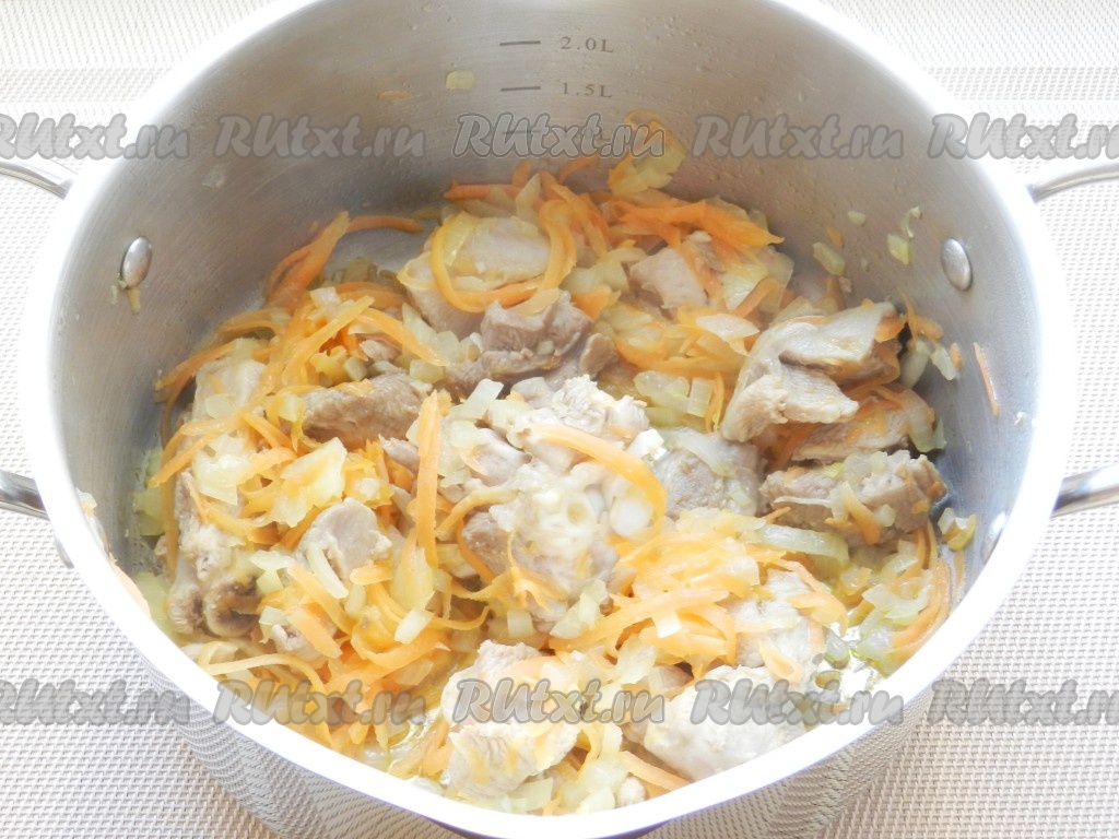 Добавить лук и морковь и обжарить все вместе.
