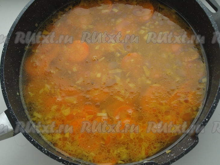 Через 15 минут добавить овощной бульон (или воду) к моркови и луку, довести до кипения, уменьшить огонь и готовить под закрытой крышкой минут 30 (до мягкости моркови).